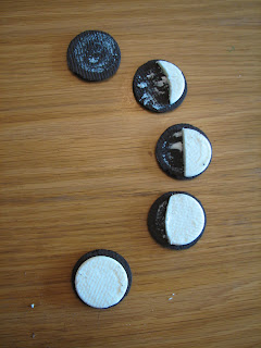 Split the cookies open and scrape off the appropriate amount of cream filling, so you're left with the desired "picture" of the moon.