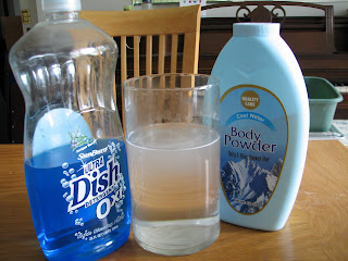 Soap breaks the surface tension of water (which is what makes it useful for cleaning) allowing the baby powder to fall through the water. It's interesting to watch - the powder will just fall through the hole made by the soap - the rest of it will continue to sit on top of the water.